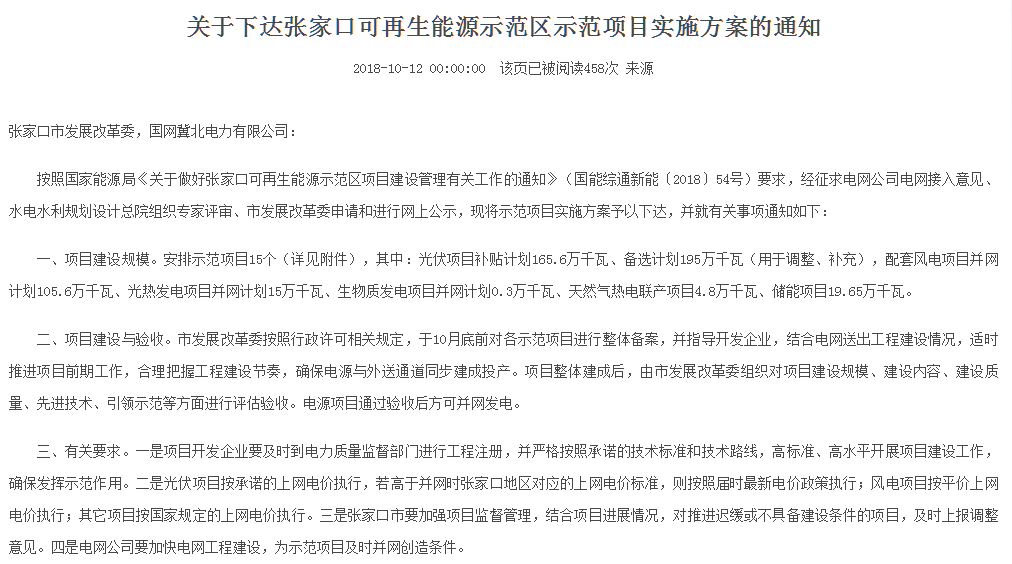 10月12日,河北張家口發(fā)布關(guān)于下達(dá)張家口可再生能源示范區(qū)示范項(xiàng)目實(shí)施方案的通知指出,安排示范項(xiàng)目15個(gè)(詳見附件),其中:光伏項(xiàng)目補(bǔ)貼計(jì)劃165.6萬千瓦、備選計(jì)劃195萬千瓦(用于調(diào)整、補(bǔ)充),配套風(fēng)電項(xiàng)目并網(wǎng)計(jì)劃105.6萬千瓦、光熱發(fā)電項(xiàng)目并網(wǎng)計(jì)劃15萬千瓦、生物質(zhì)發(fā)電項(xiàng)目并網(wǎng)計(jì)劃0.3萬千瓦、天然氣熱電聯(lián)產(chǎn)項(xiàng)目4.8萬千瓦、儲(chǔ)能項(xiàng)目19.65萬千瓦。